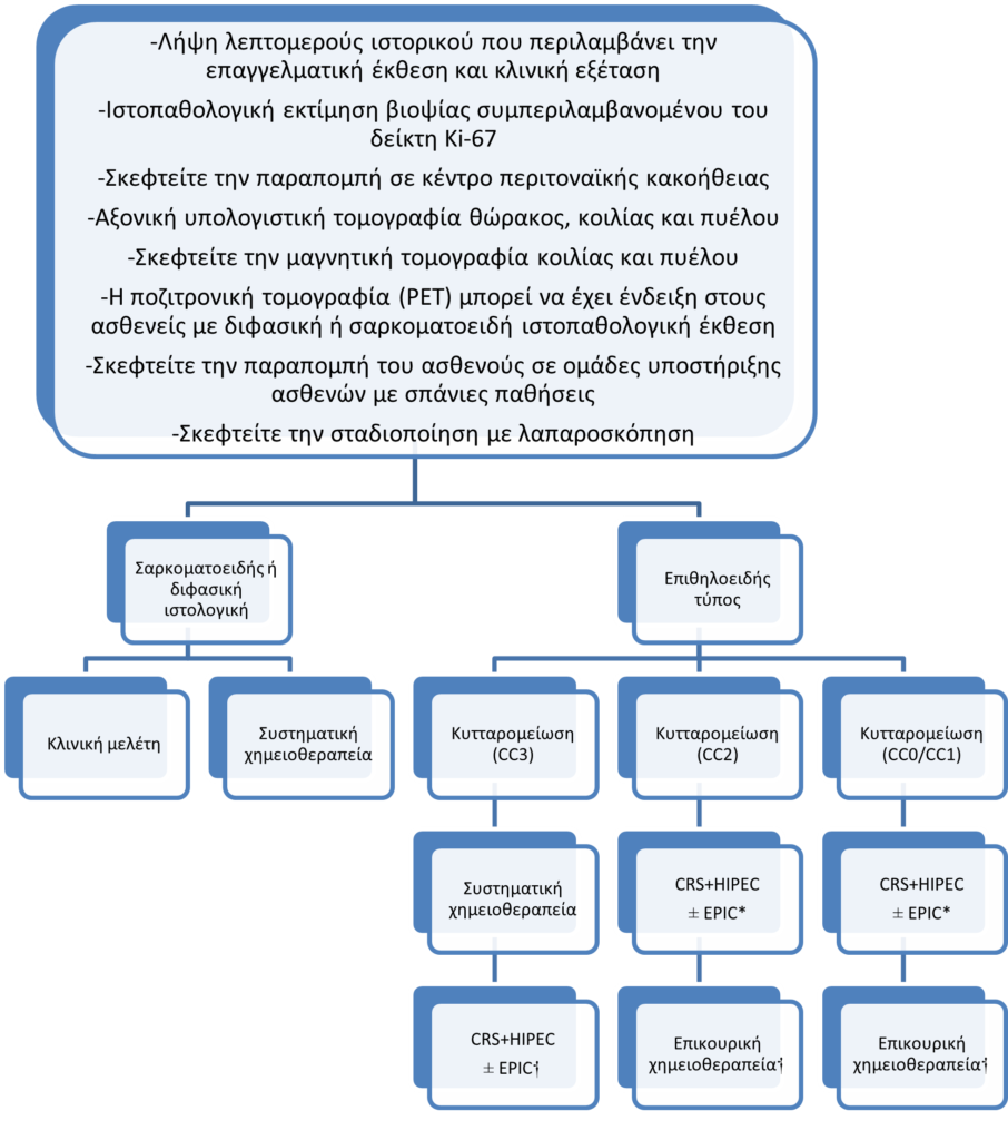 ΠΙΝΑΚΑΣ 2. Αλγόριθμος αντιμετώπισης των ασθενών με κακόηθες περιτοναϊκό μεσοθηλίωμα (CRS κυτταρομείωση, EPIC πρώιμη μετεγχειρητική ενδοπεριτοναϊκή χημειοθεραπεία, HIPEC υπέρθερμη ενδοπεριτοναϊκή χημειοθεραπεία) *Να ληφθεί υπόψη η second look λαπαροτομία από 6 μήνες ως 1 έτος 1Δεν έχει μελετηθεί εκτεταμένα η χρήση κάποιου χημειοθεραπευτικού σκευάσματος σαν νεοεπικουρική χημειοθεραπεία. Μπορεί να ληφθεί υπόψη ο συνδυασμός ενδοπεριτοναϊκής πεμετρεξίδης με ενδοφλέβια σισπλατίνη μετά από CRS και HIPEC σαν θεραπεία συντήρησης. ~Μπορεί να ληφθεί υπόψη η HIPEC για την ανακούφιση του ασκίτη, η οποία μπορεί να πραγματοποιηθεί λαπαροσκοπικά.